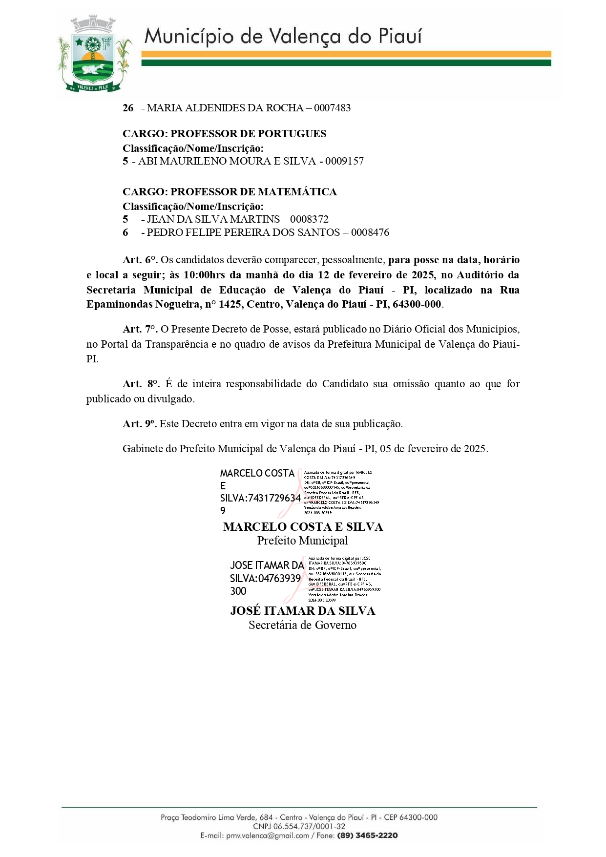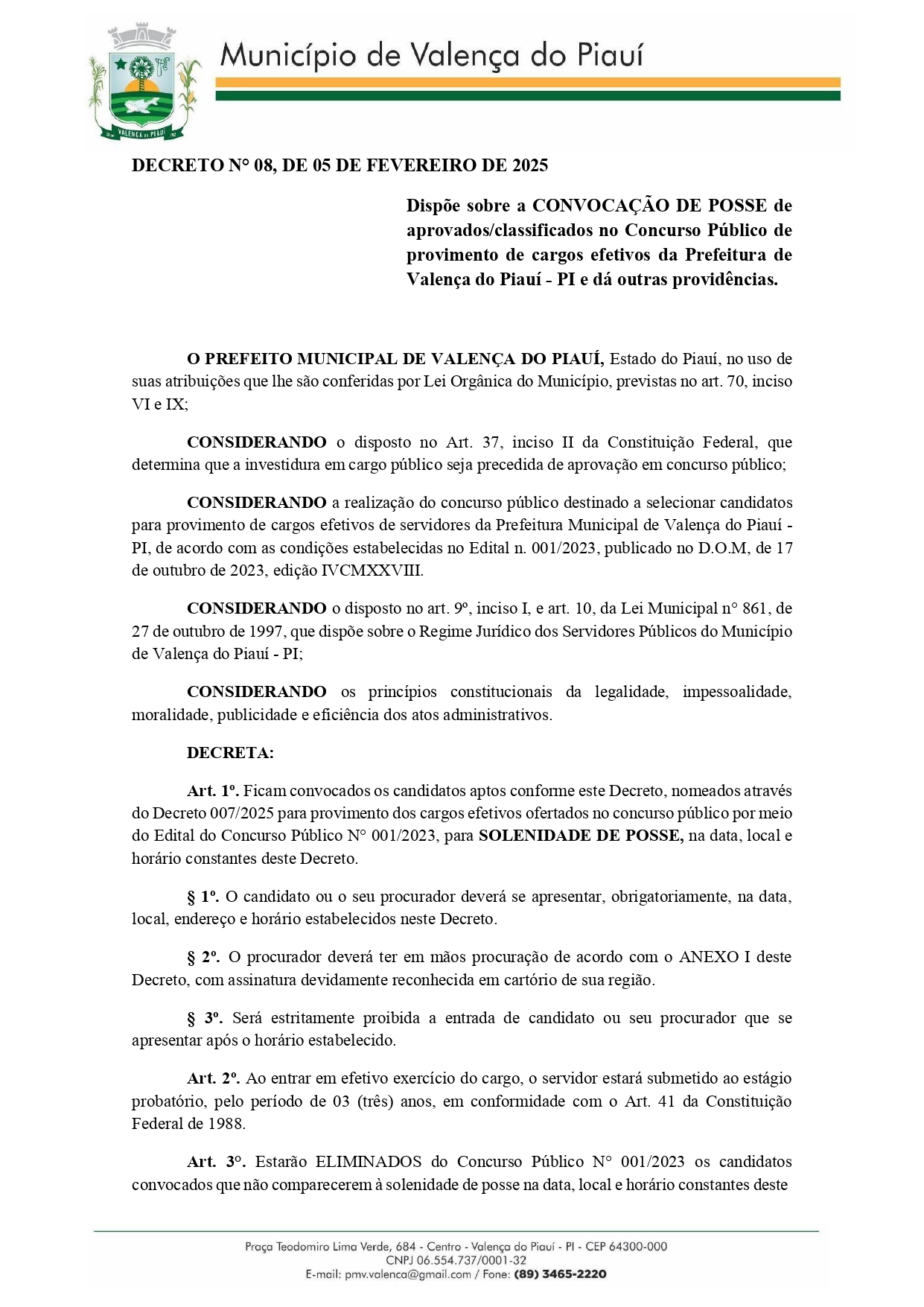 Data: 06/02/2025A Prefeitura de Valença do Piauí convocou mais 23 candidatos aprovados no concurso público realizado pelo município homologado pela gestão municipal em 2024. O Decreto 08 de convocação foi publicado na edição do Diário Oficial do Município com data desta quarta-feira, 5 de fevereiro de 2025. DECRETO 08