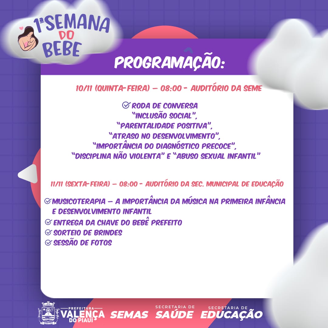Data: 05/11/2022Com o tema “Um Novo Olhar para a Primeira Infância”, a Prefeitura de Valença do Piaui, através da Secretaria Municipal de Assistência Social e com a colaboração da Secretaria de Educação e da Secretaria de Saúde realiza a partir dessa segunda-feira (7), a 1ª Semana do Bebê no auditório da Secretaria de Educação a partir das 8h da manhã.