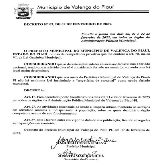 Data: 13/02/2023O Prefeito de Valença do Piaui, Marcelo Costa, assinou o Decreto 07/2023, que estabelece o Ponto Facultativo nos órgãos e entidades ligadas à Administração Pública Municipal nos dias 20, 21 e 22 de fevereiro, período em que ocorre o Carnaval.