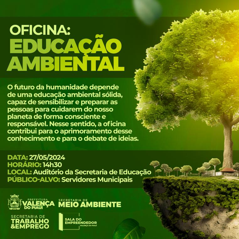 Data: 21/05/2024A Prefeitura de Valença do Piaui realiza na próxima segunda-feira (27), uma oficina sobre a Educação Ambiental por intermédio da Secretaria de Meio Ambiente, Secretaria de Trabalho e Emprego e da Sala do Empreendedorismo.