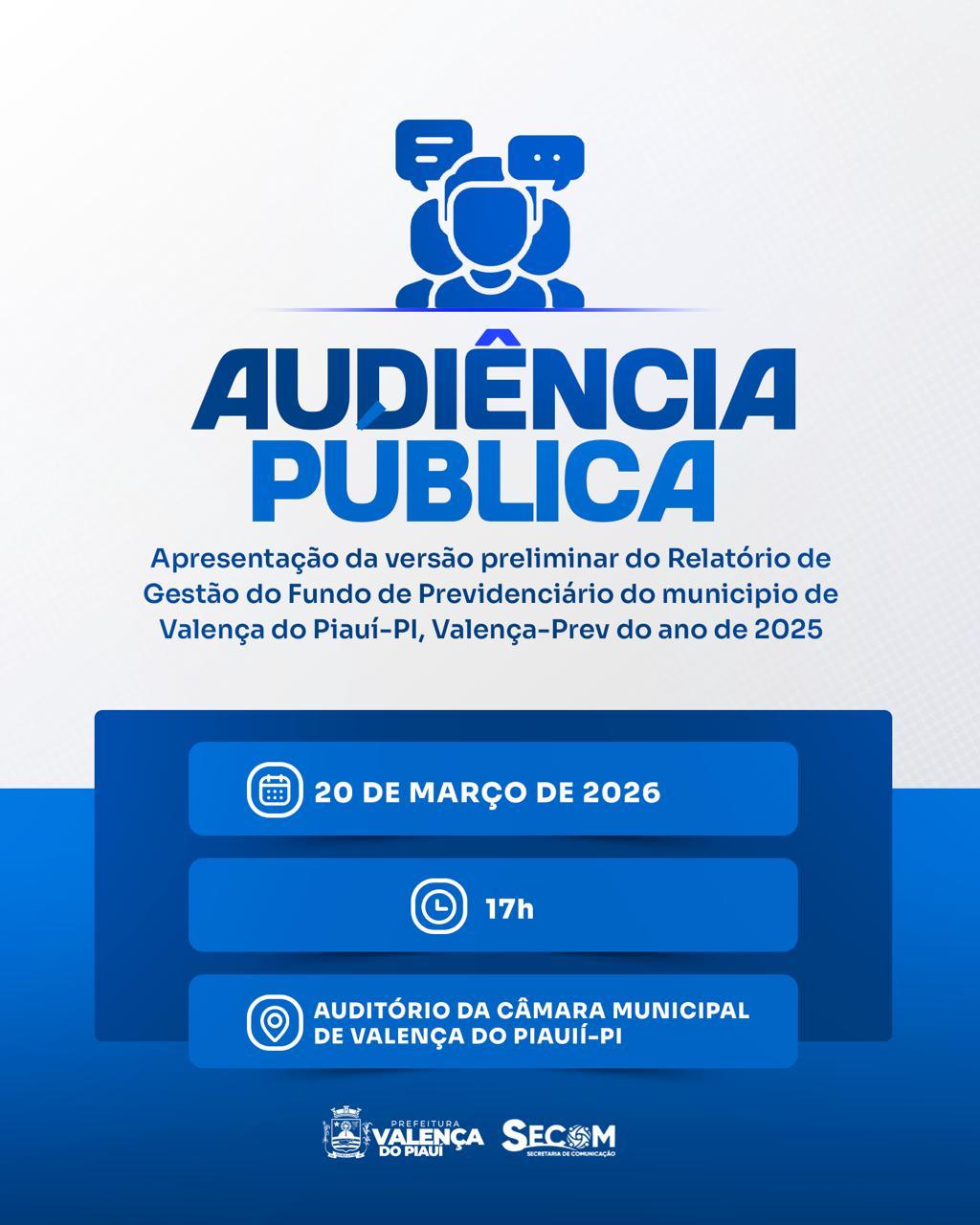 Data: 09/03/2026A gestão municipal de Valença do Piauí vai realizar uma audiência pública no dia 20 de março, às 17h, no auditório da Câmara Municipal de Valença do Piauí. O evento tem como objetivo principal a apresentação da versão preliminar do relatório de gestão do fundo previdenciário do município, o Valença-PREV, referente ao ano de 2025.
