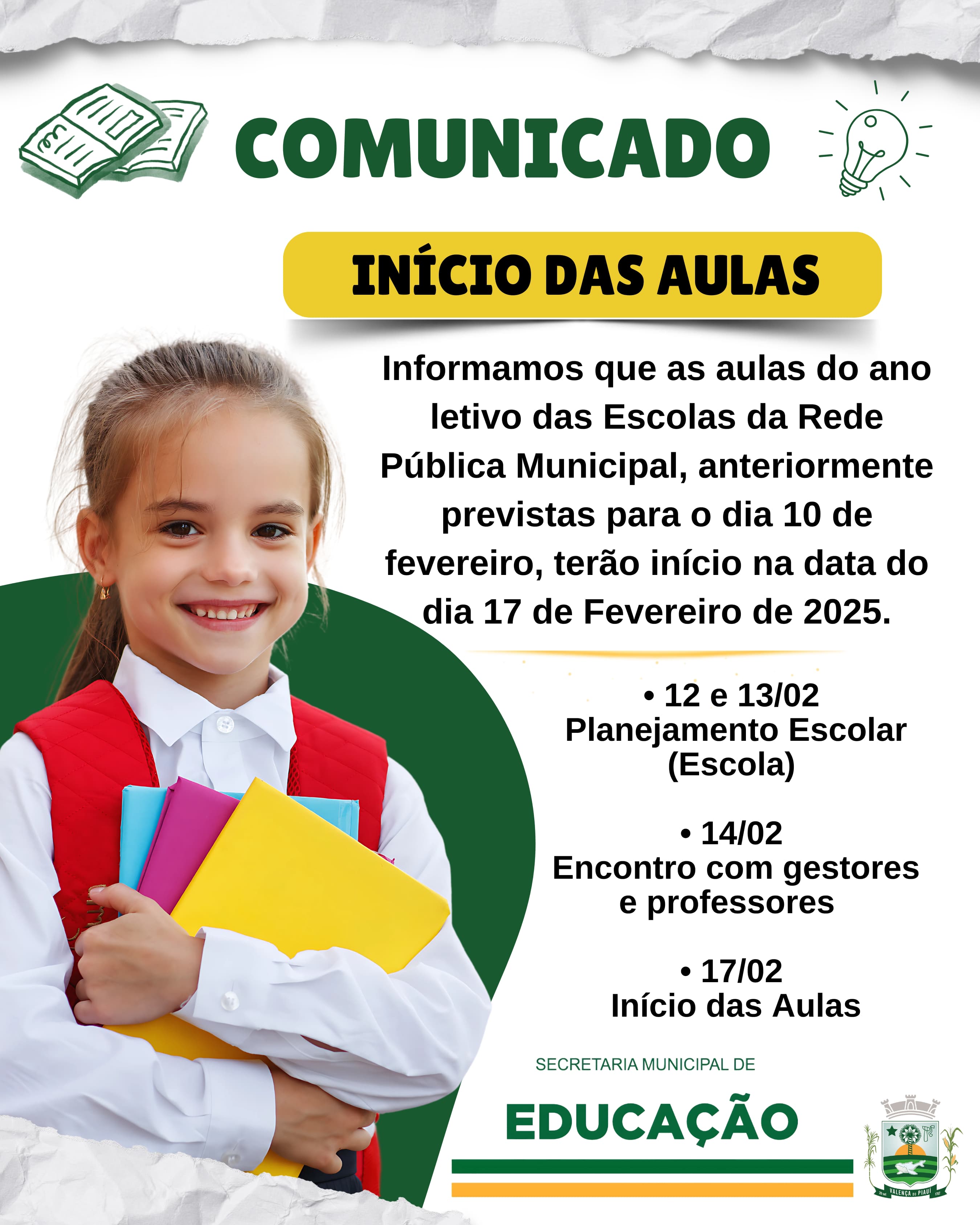 Data: 12/02/2025A Prefeitura Municipal de Valença do Piauí divulgou nesta terça-feira (11) uma atualização importante para a comunidade escolar. O início das aulas nas escolas da rede pública municipal, que estava inicialmente previsto para o dia 10, foi adiado para o dia 17 de fevereiro.
