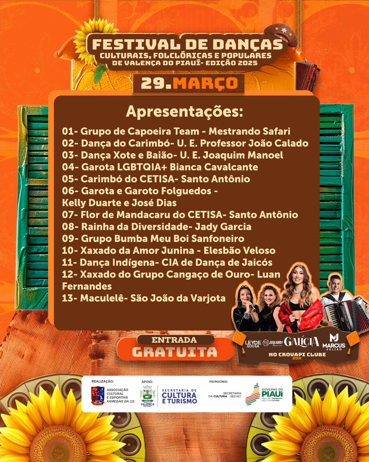 Com essa programação, o Festival de Danças Culturais, Folclóricas e Populares de Valença do Piauí investe na valorização da cultura e das tradições locais, proporcionando um momento de cultura e lazer para a população.