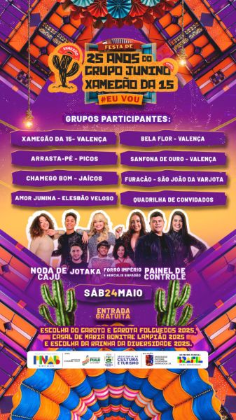 Data: 23/05/2025Neste sábado, 24 de maio, Valença do Piauí será palco de uma celebração especial, os 25 anos do Grupo Junino Xamegão da 15. O evento marca não apenas as bodas de prata do grupo, mas também a abertura oficial da temporada junina 2025 na cidade, que contará com diversas manifestações culturais em escolas, entidades, grupos juninos e do tradicional Festival Junino, (Arraiá do Gorgulho), que este ano chega à sua 35ª edição.