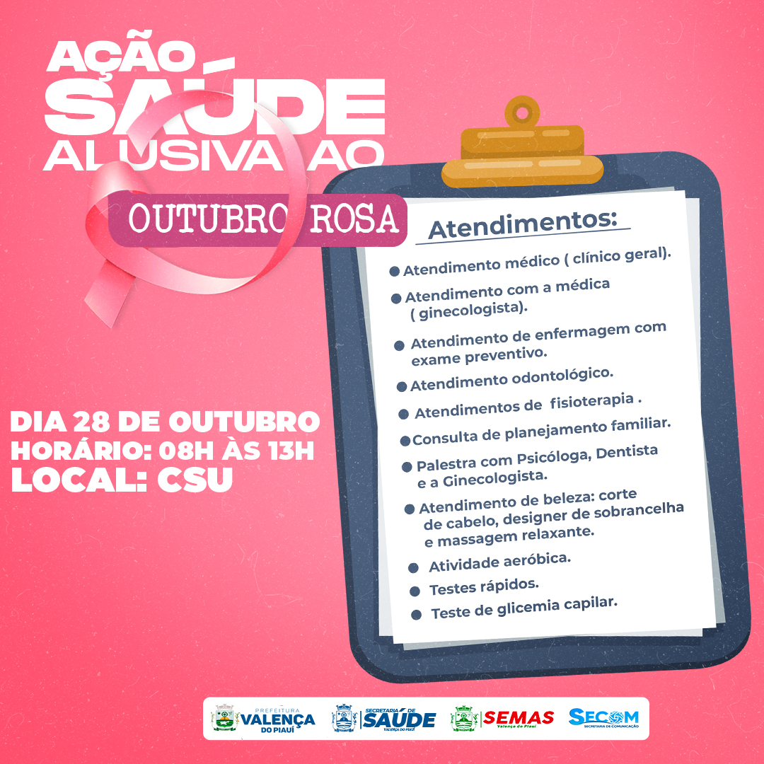 Na quinta-feira (28), a Saúde de Valença realiza uma Ação em Saúde alusiva ao Outubro Rosa com a realização de uma série de atividades, como: Atendimento médico e com ginecologista, exames preventivos, atendimento odontológico, atendimento de fisioterapia, consulta de planejamento familiar, palestras, atendimento de beleza com corte de cabelos, designer de sobrancelhas e massagem relaxante, atividade aeróbica, testes rápidos e glicemia capilar.