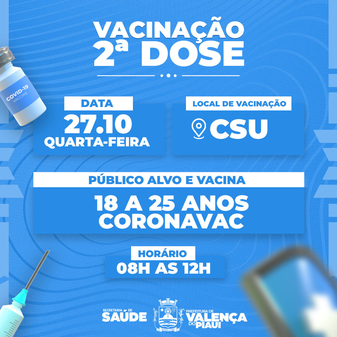 Na quarta-feira, 27 de outubro, será aplicada a segunda dose da Coronavac no público de 18 a 25 anos de idade.