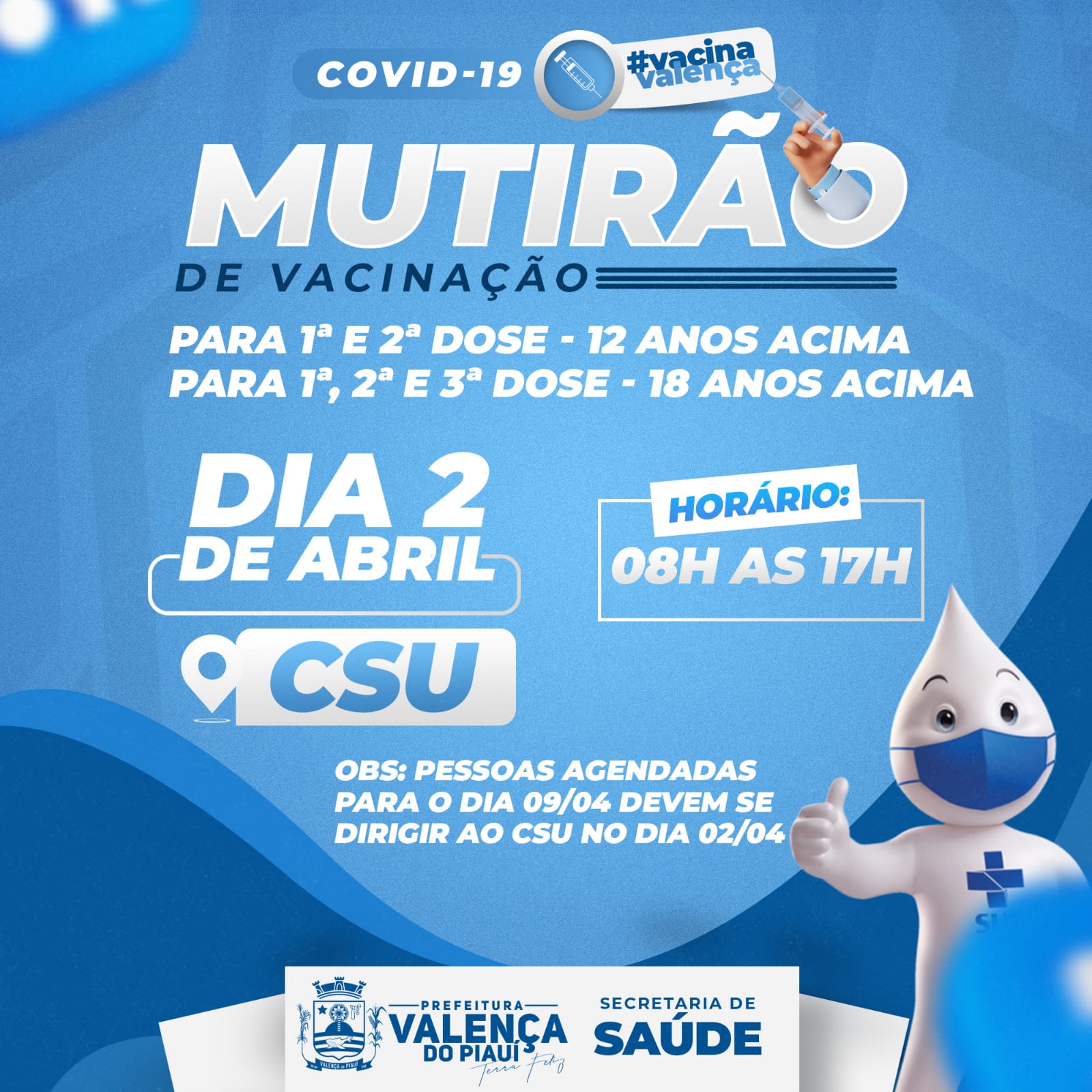 Data: 29/03/2022A Prefeitura de Valença do Piaui, por meio da Secretaria da Saúde, realizará neste sábado, 2 de abril, o mutirão de vacinação contra a Covid-19, no Centro Social Urbano (CSU) das 08h às 17h.