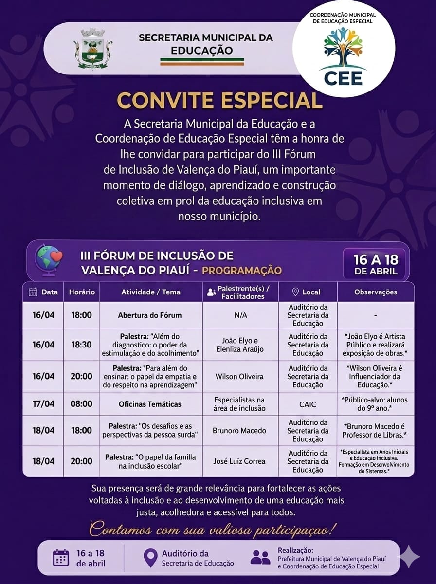 Data: 15/04/2026A Prefeitura de Valença do Piauí, por meio da coordenação de educação especial, com o objetivo de fortalecer as políticas de acolhimento e acessibilidade no ensino municipal, irá promover entre os dias 16 e 18 de abril, o III Fórum de Inclusão. O evento vai acontecer no auditório da Secretaria de Educação, sendo um momento estratégico para o diálogo e a construção coletiva em prol da educação inclusiva.